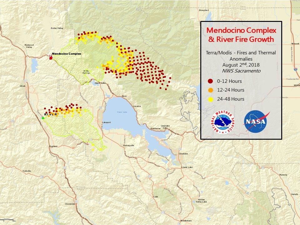 “For most of the night, both fires remained active in the upper elevations. The ridgetops reached peak relative humidity around midnight and then began to drop. The valleys and drainage's remained far less active and the fire was not as active in the unexposed areas. Firing operations on both fires took well and increased containment line. The fire continues to spread into the Mendocino National Forest and crews are scouting for opportunities ahead of the active fire's edge. Fire crews are fighting the fire aggressively. Very steep terrain and fire intensity on the fire front make it difficult to insert crews in certain areas of the fire.”