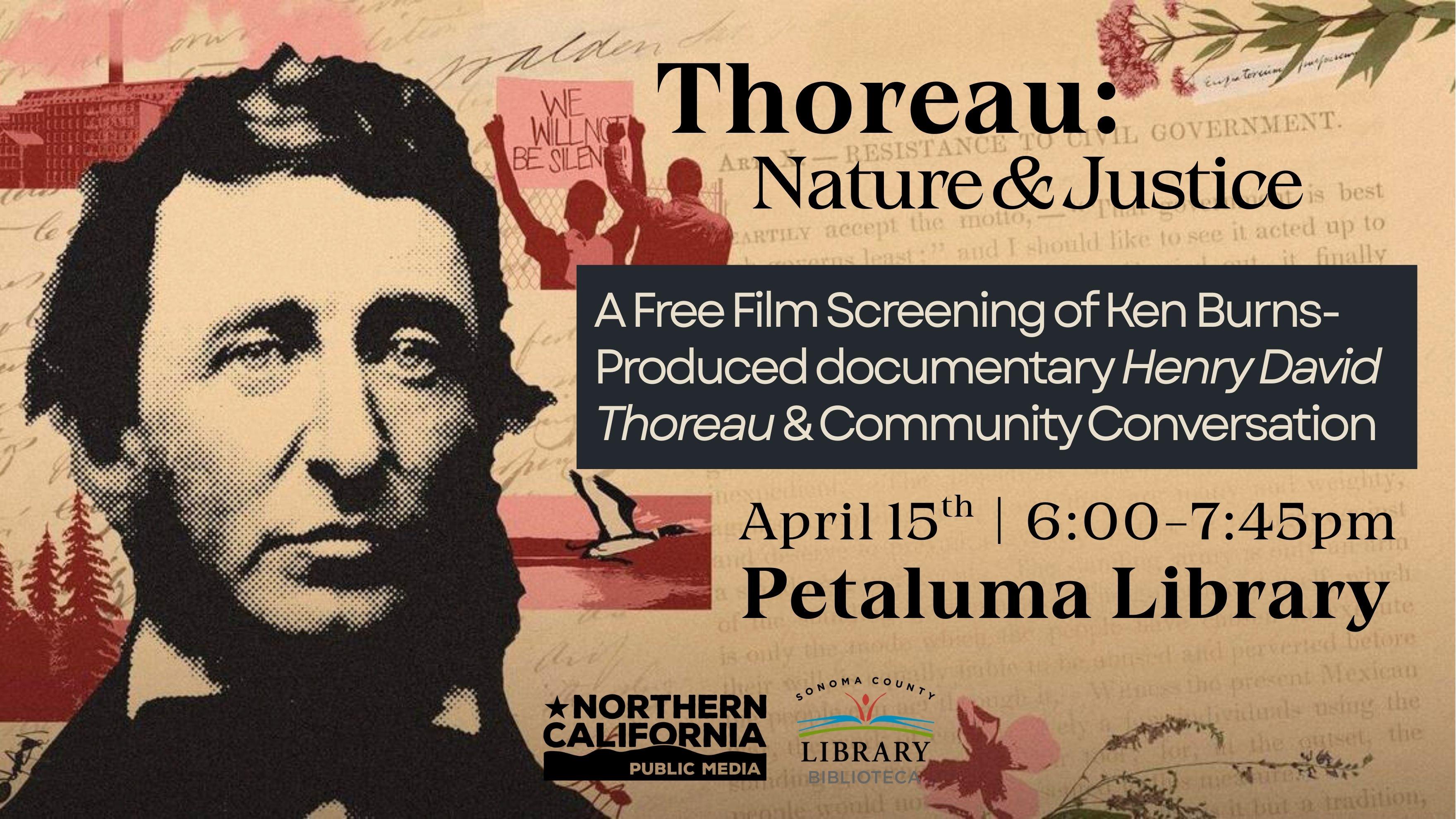 Join us at the Petaluma Library for a free screening of Ken Burns' latest documentary, Henry David Thoreau. Centered on themes of nonviolent resistance, environmental stewardship, and civic responsibility, this event invites you to connect Thoreau’s ideas to today’s world.